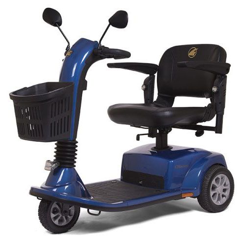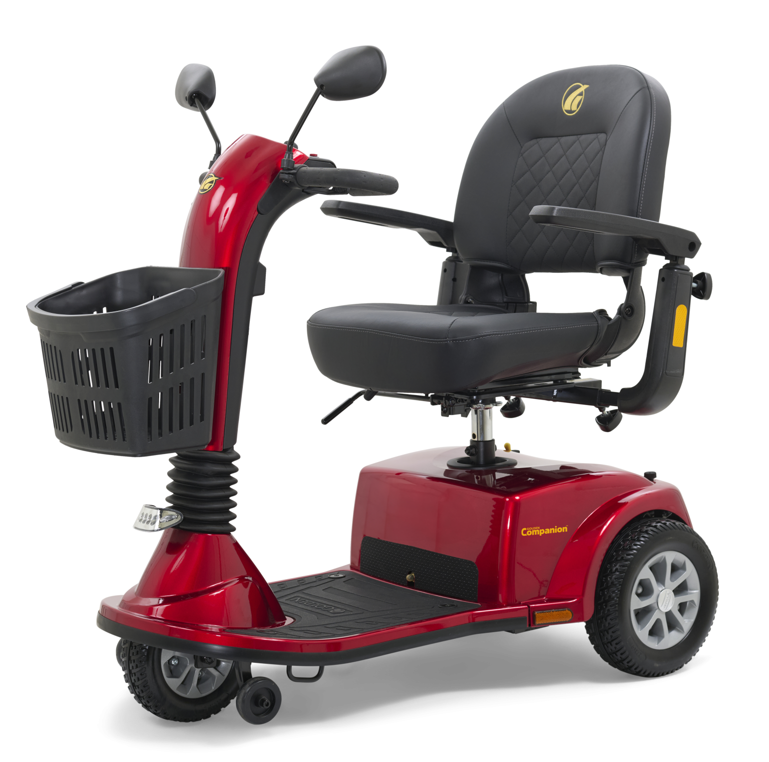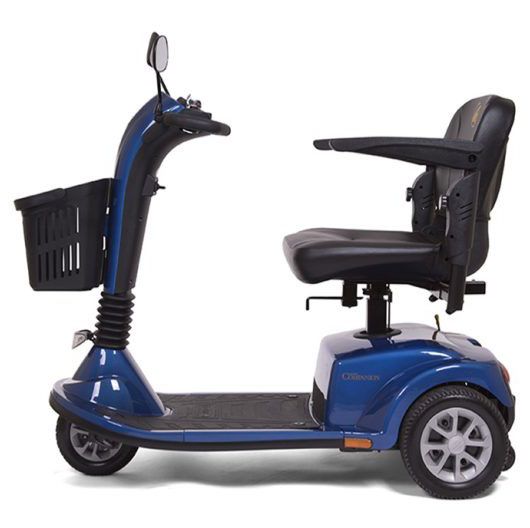The three-wheel LiteRider™ scooter from Golden features better range, a Delta Tiller standard, more attractive styling and more vibrant colors. A modern tubular frame design supports its 300 lb. weight capacity and its completely wireless disassembly makes transporting a breeze. The LiteRider GL111’s 9-inch, black low-profile tires are mounted on high-strength steel rims with shiny hubcaps. Its plush, deep-black vinyl stadium style seat comes with adjustable armrests and a full 360-degree swivel mechanism for getting on and off the scooter easily. You will also appreciate our two storage baskets, one on the tiller and one under the seat. A true beauty, the LiteRider scooter is available in deep shades of red and blue.