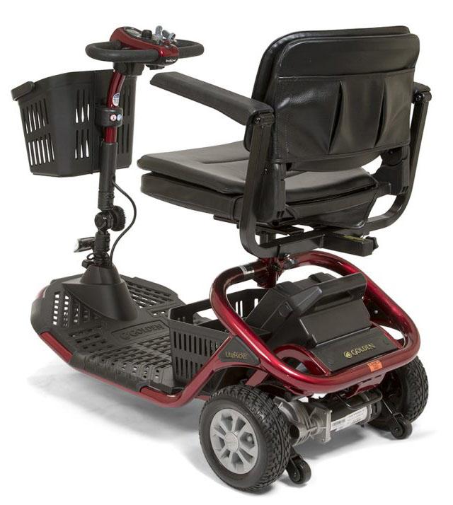 The three-wheel LiteRider™ scooter from Golden features better range, a Delta Tiller standard, more attractive styling and more vibrant colors. A modern tubular frame design supports its 300 lb. weight capacity and its completely wireless disassembly makes transporting a breeze. The LiteRider GL111’s 9-inch, black low-profile tires are mounted on high-strength steel rims with shiny hubcaps. Its plush, deep-black vinyl stadium style seat comes with adjustable armrests and a full 360-degree swivel mechanism for getting on and off the scooter easily. You will also appreciate our two storage baskets, one on the tiller and one under the seat. A true beauty, the LiteRider scooter is available in deep shades of red and blue.